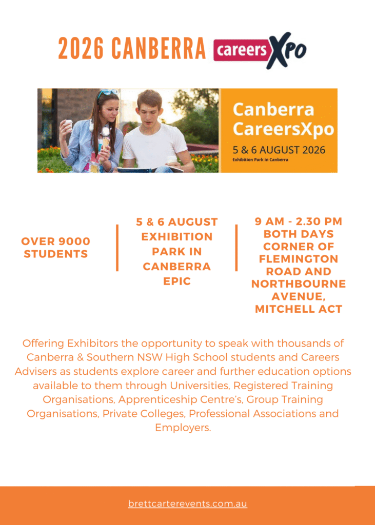 Brett Carter Events invites your company and/or organisation to exhibit at the 2026 Canberra CareersXpo to provide information, advice and answers to questions to potential students/trainees and/or employees/clients.